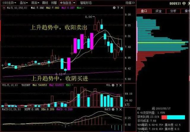 这一口诀与第一诀有点类似,就是讲逆市而动的道理,第一诀是说短线的,第二诀是说中线的。即,买时,选择K线收阴线时买;卖时,选择K线收阳线时卖。
